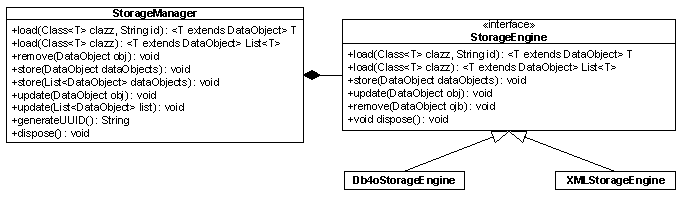 We decided to use db4objects as the primary storage container which is an object oriented database and among others available under the GPL license. The class db4oStorageEngine implements the StorageEngine interface and realises the access to db4objects.