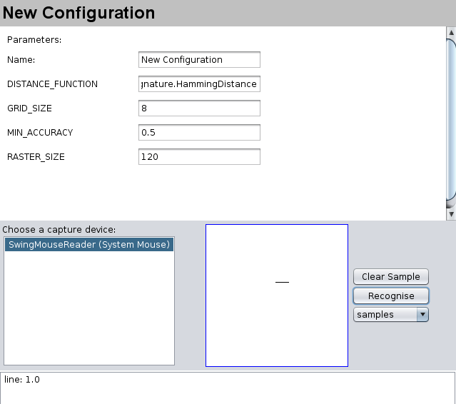 The Algorithm view shown in Figure 4 shows the parameters of the algorithm in the upper half of the view. The lower half can test the recognition of a gesture shown in the capture area. A gesture set has to be selected. After the recognition process has finished, the result list is shown on the bottom.