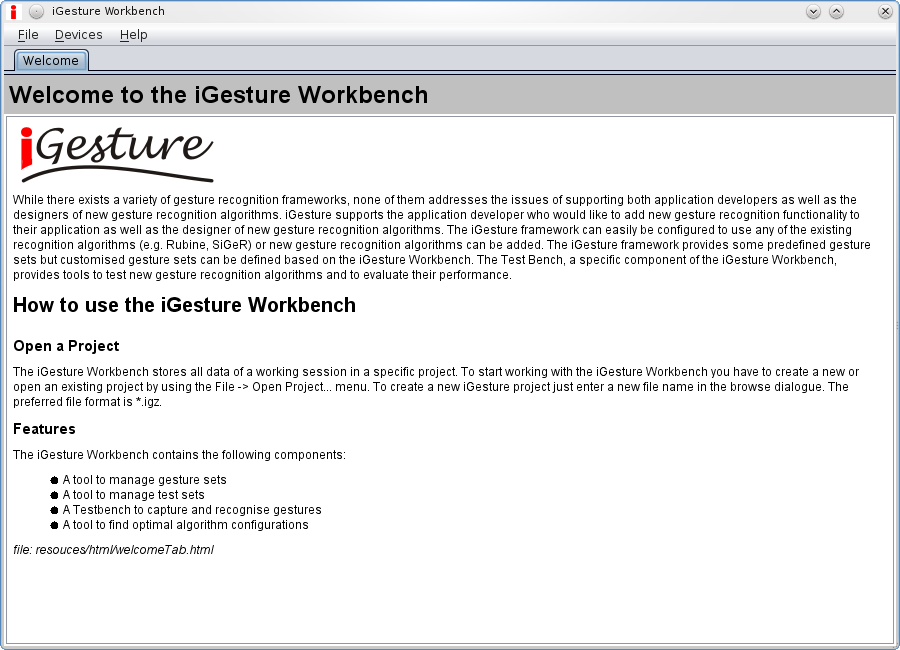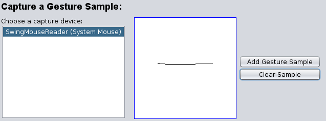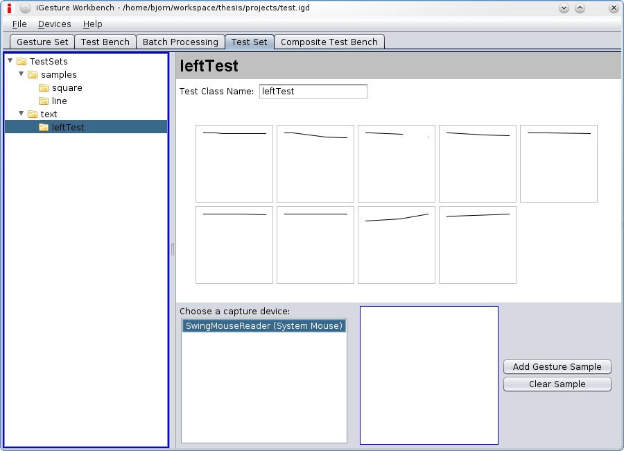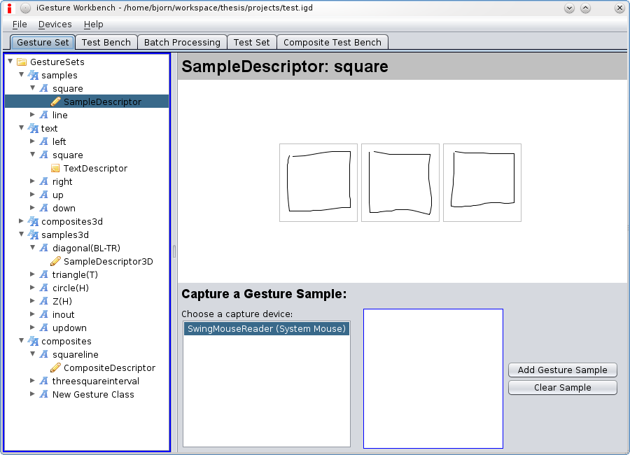 The Test Bench Tab shown in Figure 4 provides functionality to acquire a gesture from the input device and recognise it with the gesture set and algorithm of the user's choice. This enables a simple and quick test of specific gestures. All gesture sets of the currently opened database are available and the algorithms can be selected.