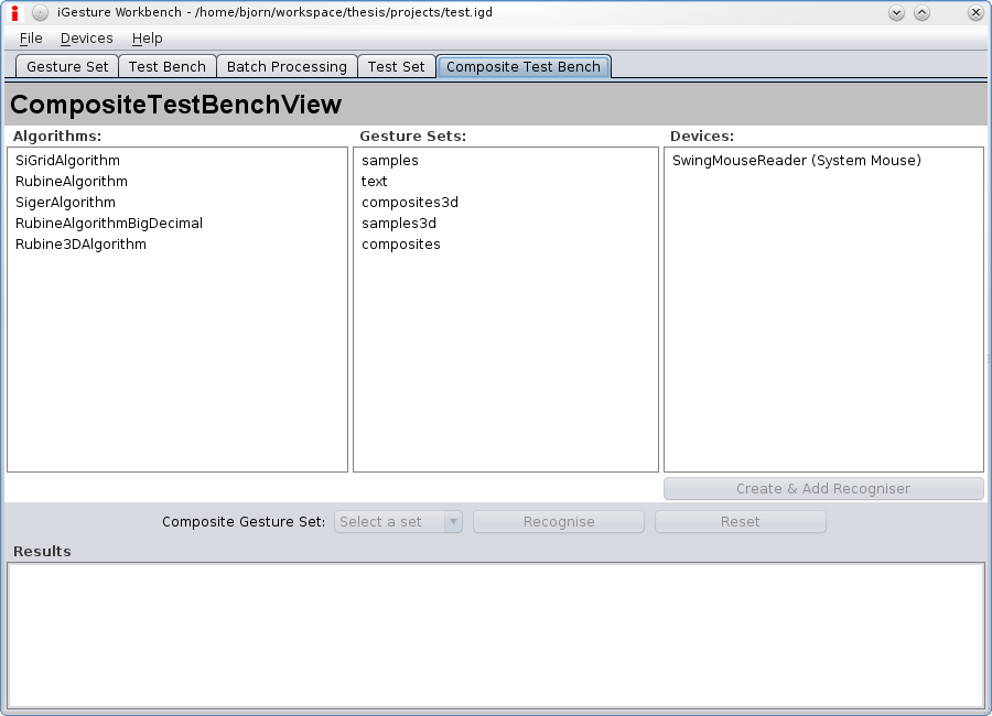 The Composite Test Bench Tab is used to test the recognition of composite gestures. One or more Recognisers can be created by selecting one or more algorithms, gesture sets and devices that send their captured input to the Recogniser. Then the Multi-modal Recogniser can be configured with a gesture set with composite gestures and the recognition process can be started. The recognition results are displayed on the bottom.