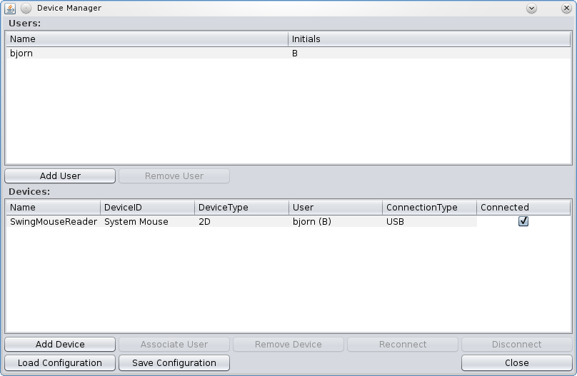 The Device Manager shown in Figure 8 provides functionality to add and remove users and devices. Devices can also be disconnected and reconnected manually. It is possible to associate a user with a device. If you have a fixed setup, it is possible to save this setup to and load it from file. A wizard is used to add a device manually.